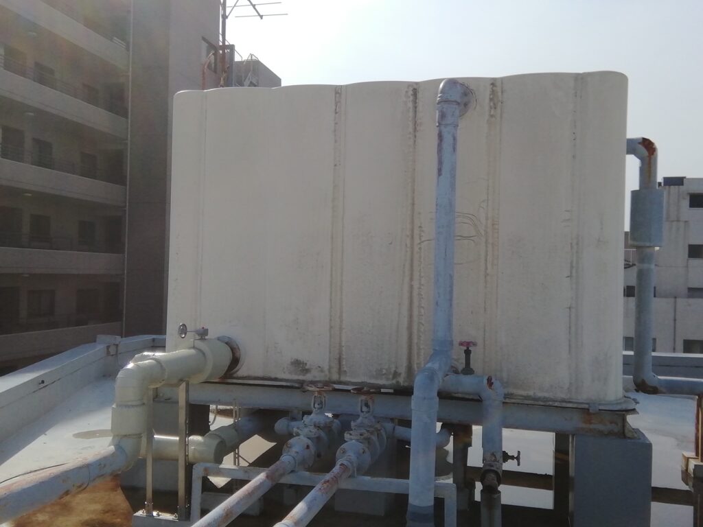 We carried out plumbing work to replace a rooftop water tank (elevated tank) that had been leaking due to aging. The work was carried out while the water pump was running, and we planned to ask businesses to refrain from using water for a total of two days (the work was carried out during closing time at night).